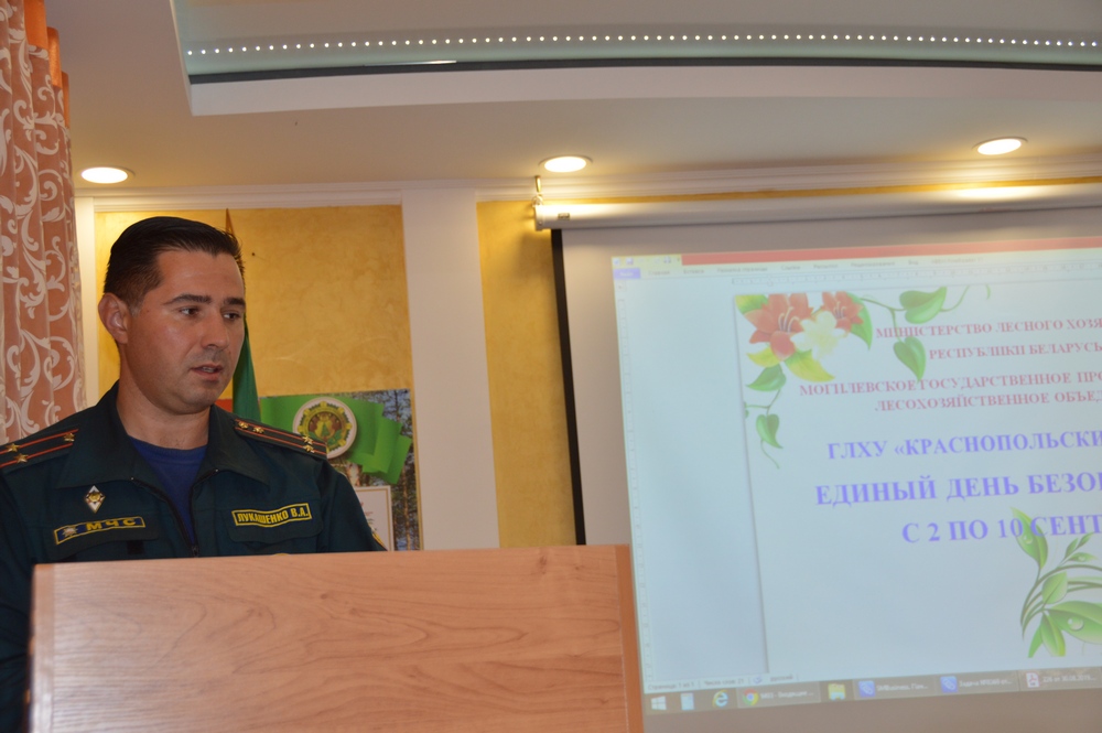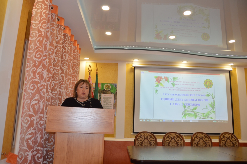 5 сентября, в актовом зале лесхоза, в рамках проведения единого дня безопасности состоялась встреча с начальником Краснопольского РОЧС В.А.Лукашенко и помощником врача – энтомолога УЗ «Краснопольская райЦГЭ» Т.Д.Крыжевской. На встрече с коллективом были озвучены вопросы: пожарной безопасности, безопасного пребывания в лесу, подготовка к отопительному сезону, меры безопасности и действия при укусе клеща. А также выступила инженер охраны труда А.В.Маслова, по месячнику охраны труда со 2 сентября по 2 октября 2019 года, проводимого Министерством лесного хозяйства Республики Беларусь.