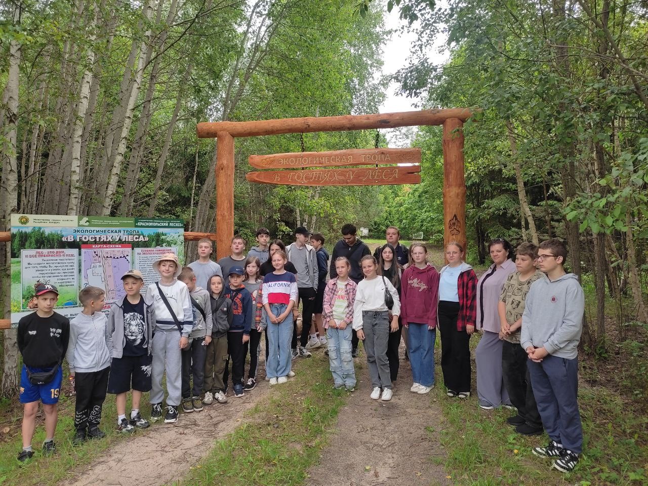 Сегодня воспитанники лагеря дневного пребывания УО «Краснопольской районной государственной гимназии» побывали на экологической тропе «В гостях у леса». Мальчишки и девченки прошли по маршруту познакомились с правилами пребывания на экологической тропе, узнали не только о растениях, птицах и животных, которые есть в лесу, но и о памятных местах Краснопольского района.