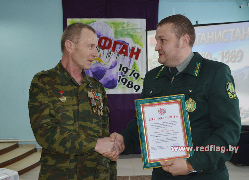 Председатель Краснопольской районной организации “Белоруский Союз ветеранов войны в Афганистане” Александр Викторович Жебин в свою очередь вручил Благодарственное письмо за оказанную помощь в работе по увековечению памяти воинов-интернационалистов уроженцев района «Краснопольский лесхоз»