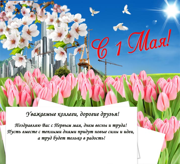 Поздравляем вас с праздником весны и труда! Пусть в этот первый майский день ласковое солнце осветит вашу жизнь и вдохновит на новые трудовые свершения. Желаем вам мира, бодрого и радостного настроения, вечной весны в душе. Пусть ваши рабочие дни будут творческими и плодотворными, результаты труда приносят удовлетворение.