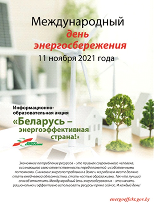 11 ноября международный День энергосбережения, в связи с этим с 8 по 12 ноября 2021 года, будет проводиться республиканская информационно - образовательная акция «Беларусь – энергоэффективная страна».