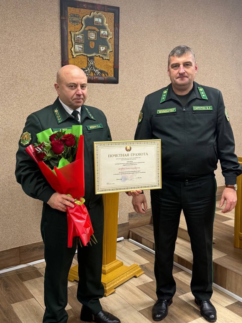 Перед началом заседания коллегии генеральный директор Могилевского ГПЛХО Владимир Сиротин вручил Почетную грамоту Министерства лесного хозяйства Республики Беларусь директору Краснопольского лесхоза Сергею Жебину за многолетний добросовестный труд и большой личный вклад в разв